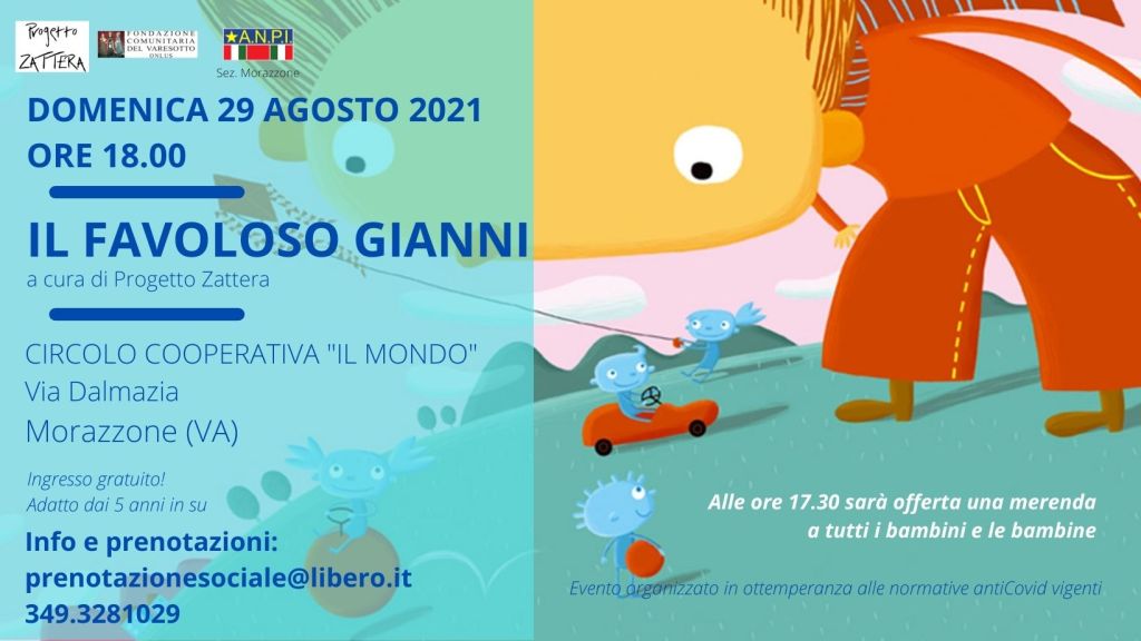 Domenica 29 agosto al parco del circolo cooperativa “Il Mondo” a Morazzone in via Dalmazia si terrà, a cura di Progetto Zattera, lo spettacolo “Il favoloso Gianni”