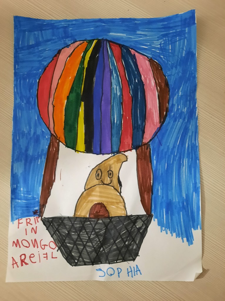 Vi scrivo per ringraziarvi dello spettacolo di oggi, mia figlia si è divertita molto e ha seguito tutta la storia con molto interesse. Appena arrivata a casa ha iniziato a disegnare la parte della storia che ha preferito, cioè quando Fritz vola con la mongolfiera. Mi piacerebbe che vediate il disegno per ringraziarvi ancora della bellissima esperienza.