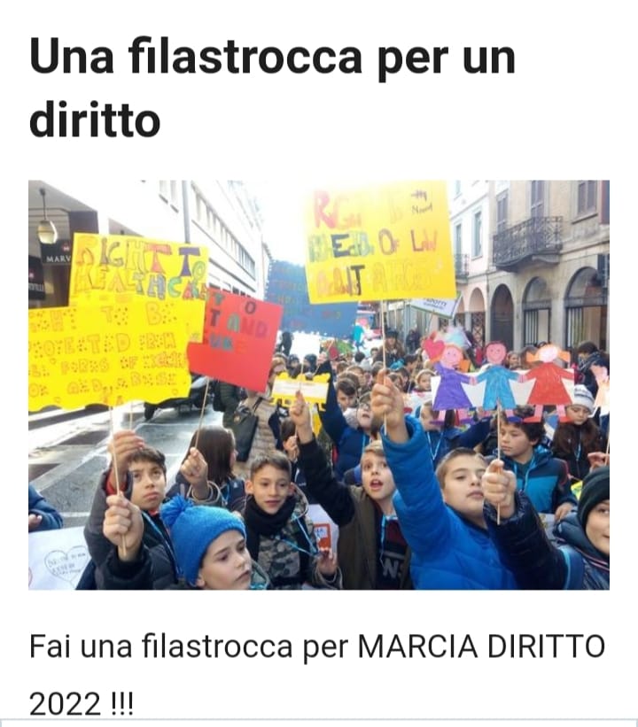 Buongiorno stiamo preparando il quaderno delle filastrocche per Marcia Diritto 2022 se non hai ancora inviato la tua proposta abbiamo la scadenza il 23 gennaio 2023 grazie mille buona giornata anche a voi!!!