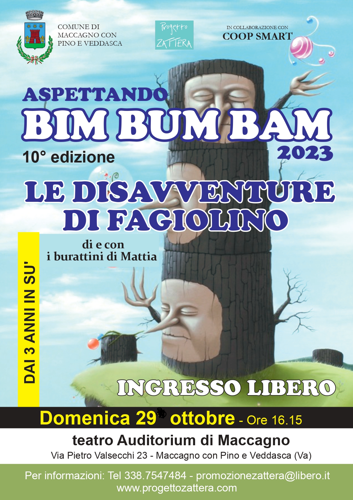 Grazie alla collaborazione e al sostegno del Comune di Maccagno con Pino e Veddasca e alla fondazione Cariplo, la rassegna “Bim Bum Bam” decima edizione riparte con la grinta di sempre. E visto il riscontro positivo della ultima edizione, dove le compagnie coinvolte hanno dato forma a una rassegna dal vivo che mancava dal 2020, vi invitiamo a dare voce a questa bella iniziativa per le famiglie che arriva alla sua decima edizione. Vi aspettiamo numerosi per il bellissimo programma il primo ottobre 2023.